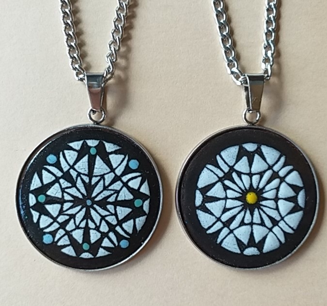 A tűzzománc medálok 7 mm nemesacél akasztóval a 3 mm vastag minőségi nemesacél láncon függenek. A tűzzománc rész ütéstől védendő üveg felület, a színei viszont tartósak. A tűzzománc medál 30 mm átmérőjű vörösréz felület, mely sima szélű nemesacél tokba van helyezve. Ékszerragasztóval és HOSH ipari ragasztóval erősen rögzítve. A nemesacél alap és a lánc antiallergén, kopásálló, a színét megtartja. Kérésre a nemesacél lánc típusa cserélhető a készlet erejéig. E-mailben ehhez szükség esetén mintát küldök. A megadott ár darabonként értendő.