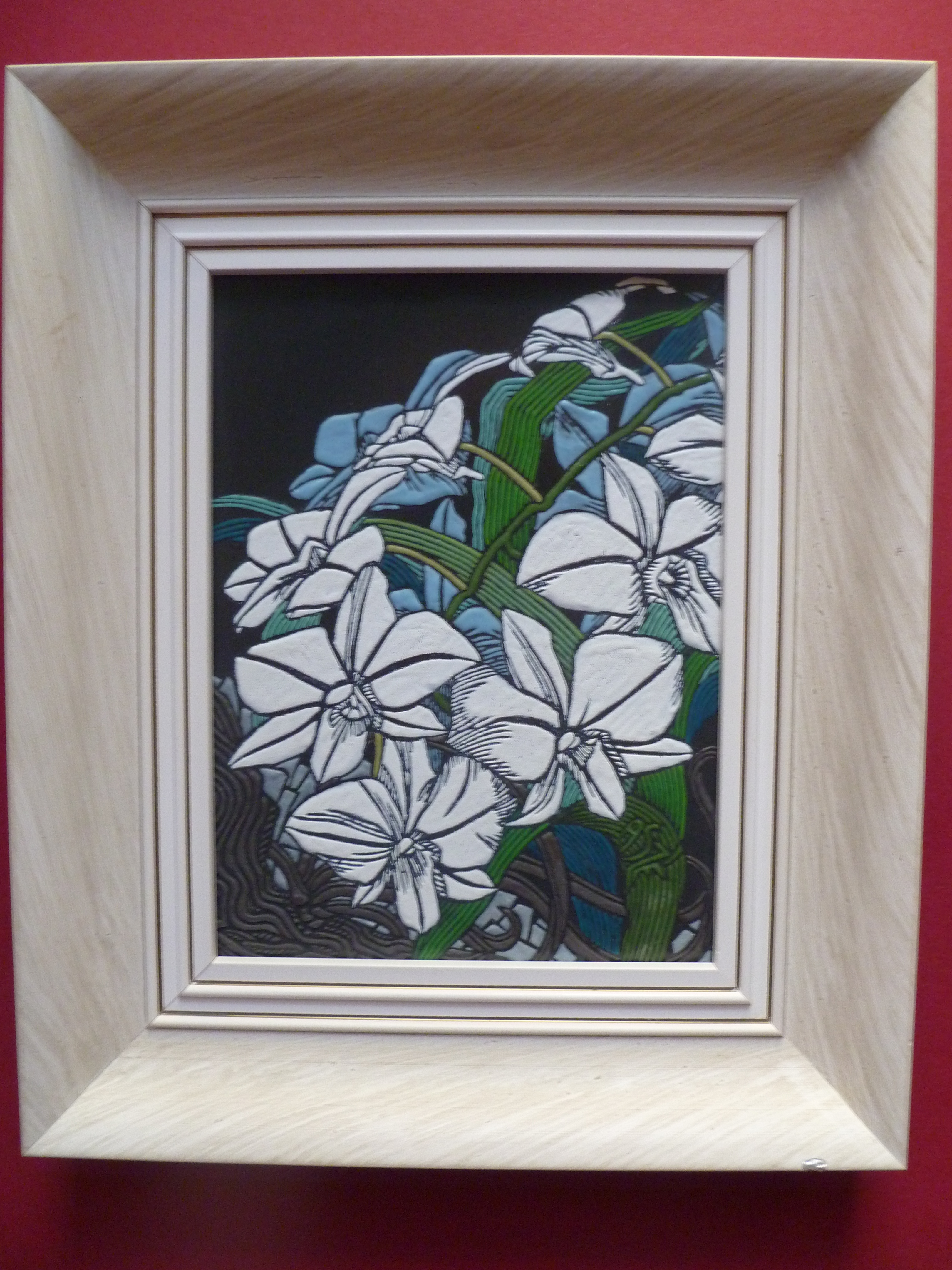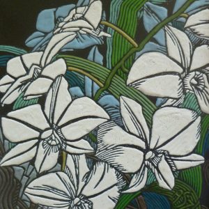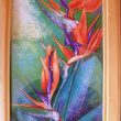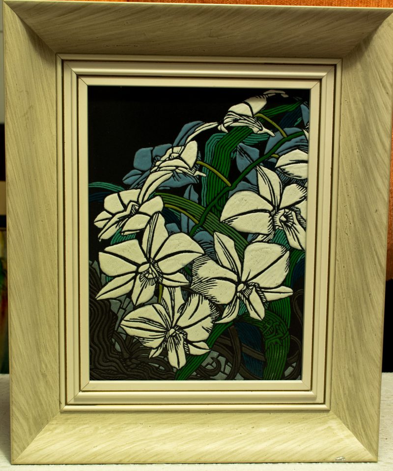 A sötét szürke alapon fehér, világoskék, kék, mohazöld, fűzöld, zöld, világos türkiz, szemcsés szürke, sötét fémes színekkel kialakított formák, virágok, levelek egzotikus hangulatot adnak. A keret minőségi fehér, halványszürkés cirmos hatású fakeret. Szélessége: 45mm, legnagyobb vastagsága a szélén:35mm. A kép kiállításon szerepelt, a keret jobb alsó sarkánál alig észrevehető sérülés található kicsit korrigálva. A feltüntetett vételárból ezért 1000Ft kedvezmény kerül levonásra vétel esetén.