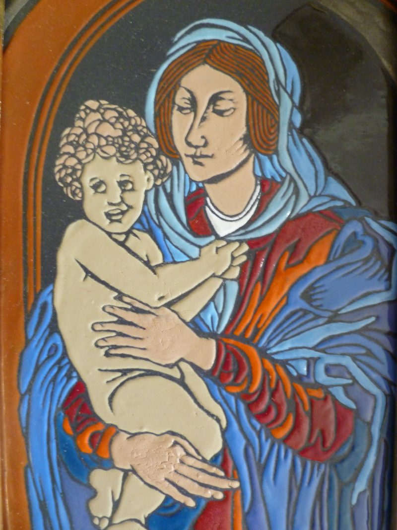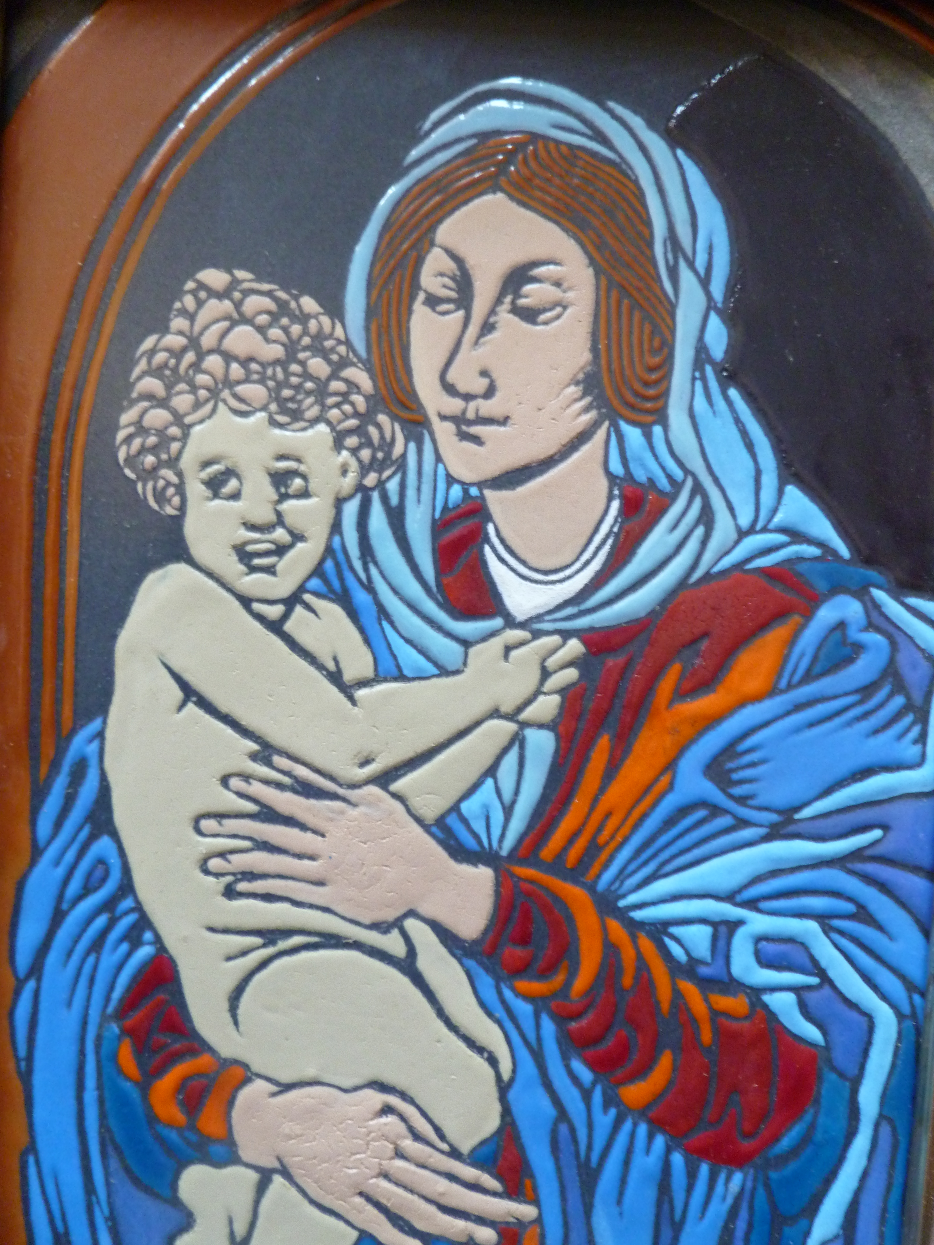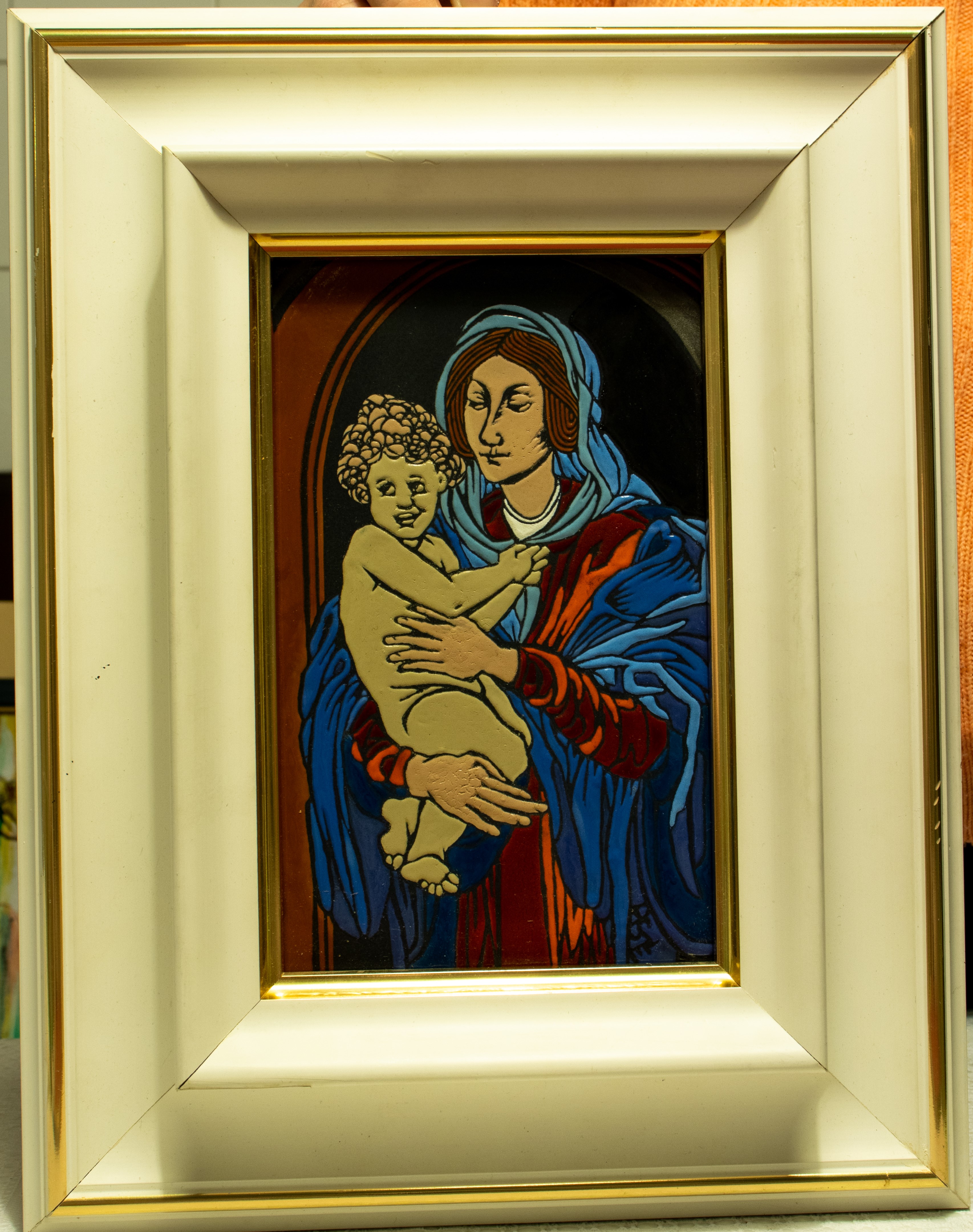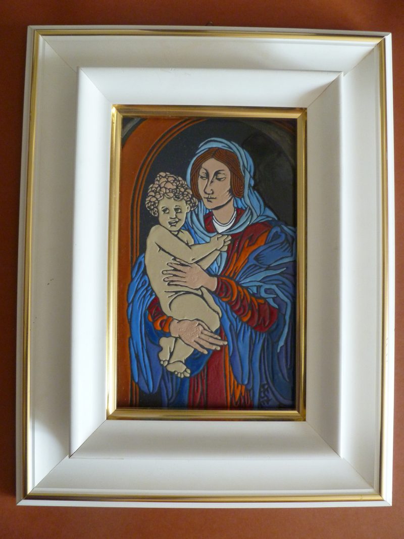 Az acél képlemez mérete:12X20cm Kerettel megnövelt méret: 25,5X33cm A keret minőségi fehér, arany színezetű fakeret. Szélessége: 60mm, legnagyobb vastagsága:40mm, szegélyén 10mm. A barna, bordó, narancs, világosbarna, krém, fehér, világoskék, középkék, sötétkék, türkiz, sötét szürke színekkel kialakított kép az örök anya-gyermek kapcsolatot ábrázolja középkori jelleggel – mint Mária és a kis Jézus. A kép kiállításon többször szerepelt, a keret felületén alig észrevehető kisebb sérülések találhatók. A feltüntetett vételárból ezért 2000Ft kedvezmény kerül levonásra vétel esetén.