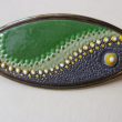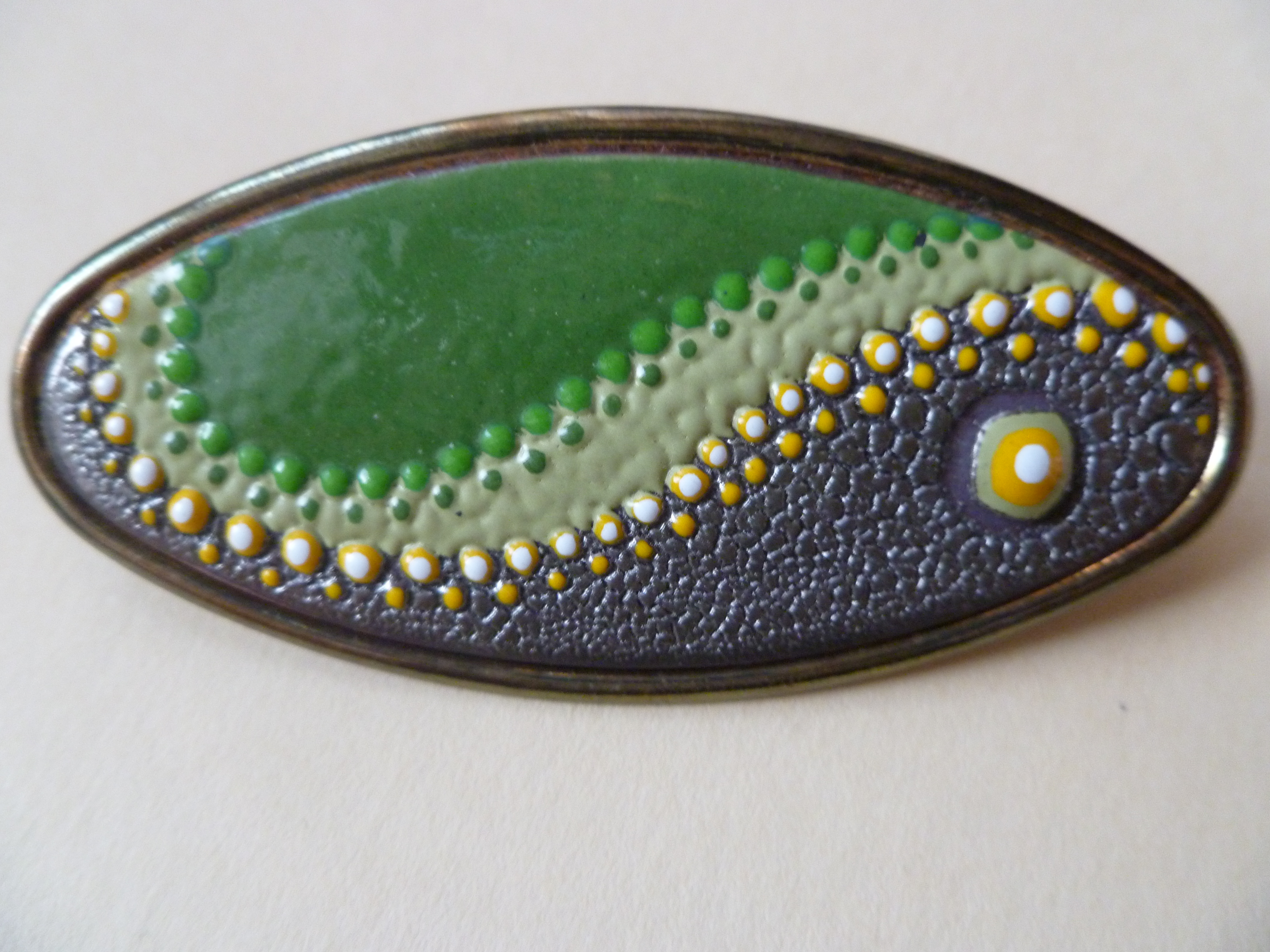 A kitűző fehér, sárga, mohazöld, zöld, világos fémes színű opak, zománc iszap ráégetéssel vörösréz alapra készült.