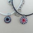 Enyhén domborított vörösréz négyzet és kör alakú lemez – lila, fekete, világoskék, citromsárga, világos lila opak és áttetsző zománciszap alapon festéssel, sötét ezüst színű nemesacél fém foglalatban, amely állítható és nem oxidálódik. Érzékenyebbek is viselhetik.