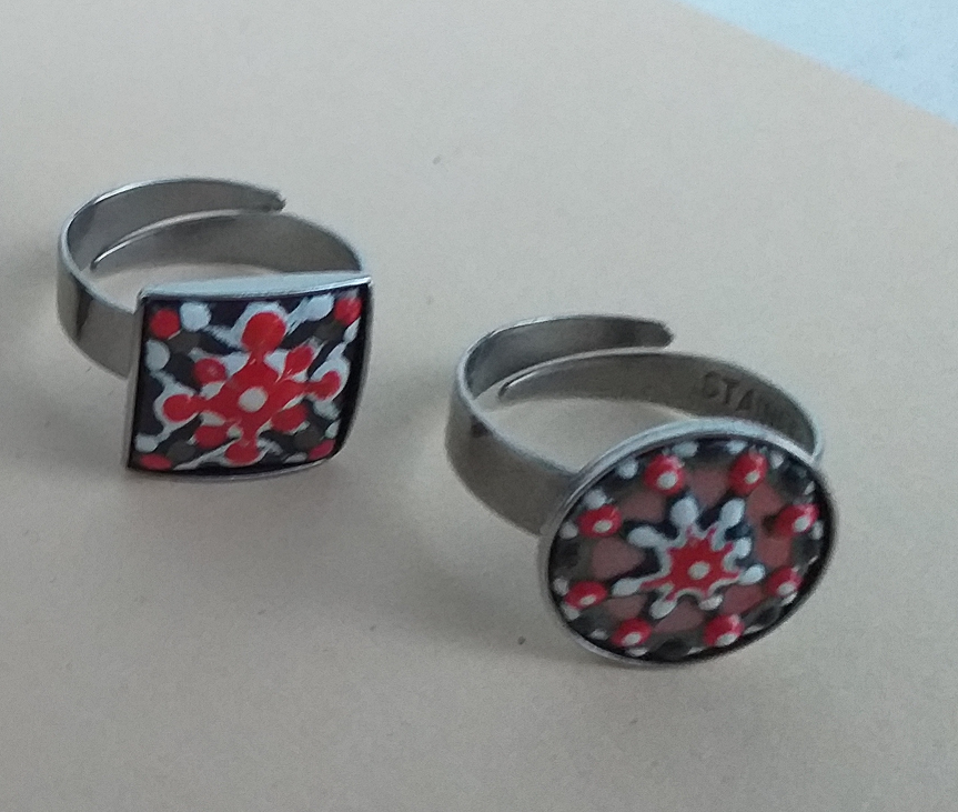 Enyhén domborított vörösréz négyzet és kör alakú lemez – vörös, fekete, ónos fehér opak és áttetsző zománciszap alapon festéssel, sötét ezüst színű nemesacél fém foglalatban, amely állítható és nem oxidálódik. Érzékenyebbek is viselhetik.