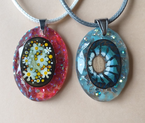 - EM03 Virágos – A zománcozott vörösréz korong titánfehér, citromsárga, narancssárga és fekete opak (nem áttetsző) és áttetsző zománc iszappal festett, 850 fokon égetett. Epoxigyantába ágyazva vöröses strasszkövekkel díszítve, fehér színű viaszolt szálon függ.