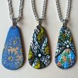 A tűzzománc medálok hosszúkás vörösréz lemezre zománciszap festéssel készültek, 860 C fokon kétszeri égetéssel. A medálok 7 mm nemesacél akasztóval a 2 mm vastag, 45 cm-es viaszolt, bőrhatású szálon függ 5 cm-es ezüst színű hosszabbító lánccal. A tűzzománc rész ütéstől védendő üveg felület, a színei viszont tartósak. A tűzzománc medál 42 mm hosszú, legnagyobb szélessége 21mm, hátoldala polírozott, és festékkel bevont. A megadott ár darabonként értendő. Szállítás a méretéből adódóan történhet levélként, légpárnázott közepes borítékban.